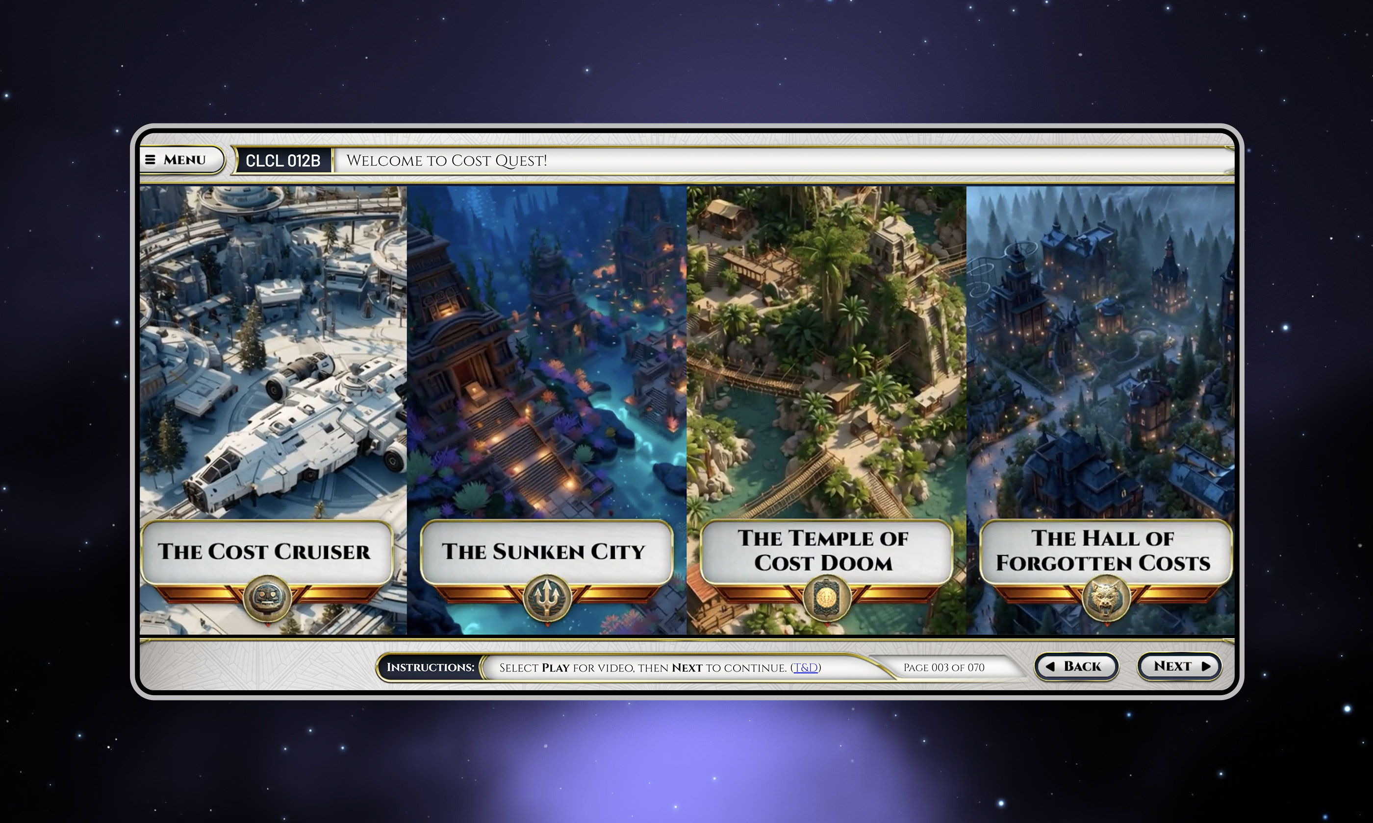 Cost Quest is an award-winning, one-hour cinematic capstone experience developed for the Defense Acquisition University’s CON 12B Product Support O&S Cost Management credential. Recognized with a 2025 MarCom Platinum Award for excellence in digital media, the experience was designed for acquisition professionals responsible for long-term sustainment planning, transforming complex Operations & Support cost forecasting into a mission-driven, interactive simulation. The project involved developing a multi-world UI system, narrative-driven puzzle mechanics, cinematic animation sequences, and a hybrid AI-assisted production pipeline while maintaining full Section 508 accessibility compliance and HTML5/SCORM deployment standards. Production combined Unreal Engine, Blender, and generative AI tools to create an immersive, scalable learning environment grounded in real-world defense acquisition processes.