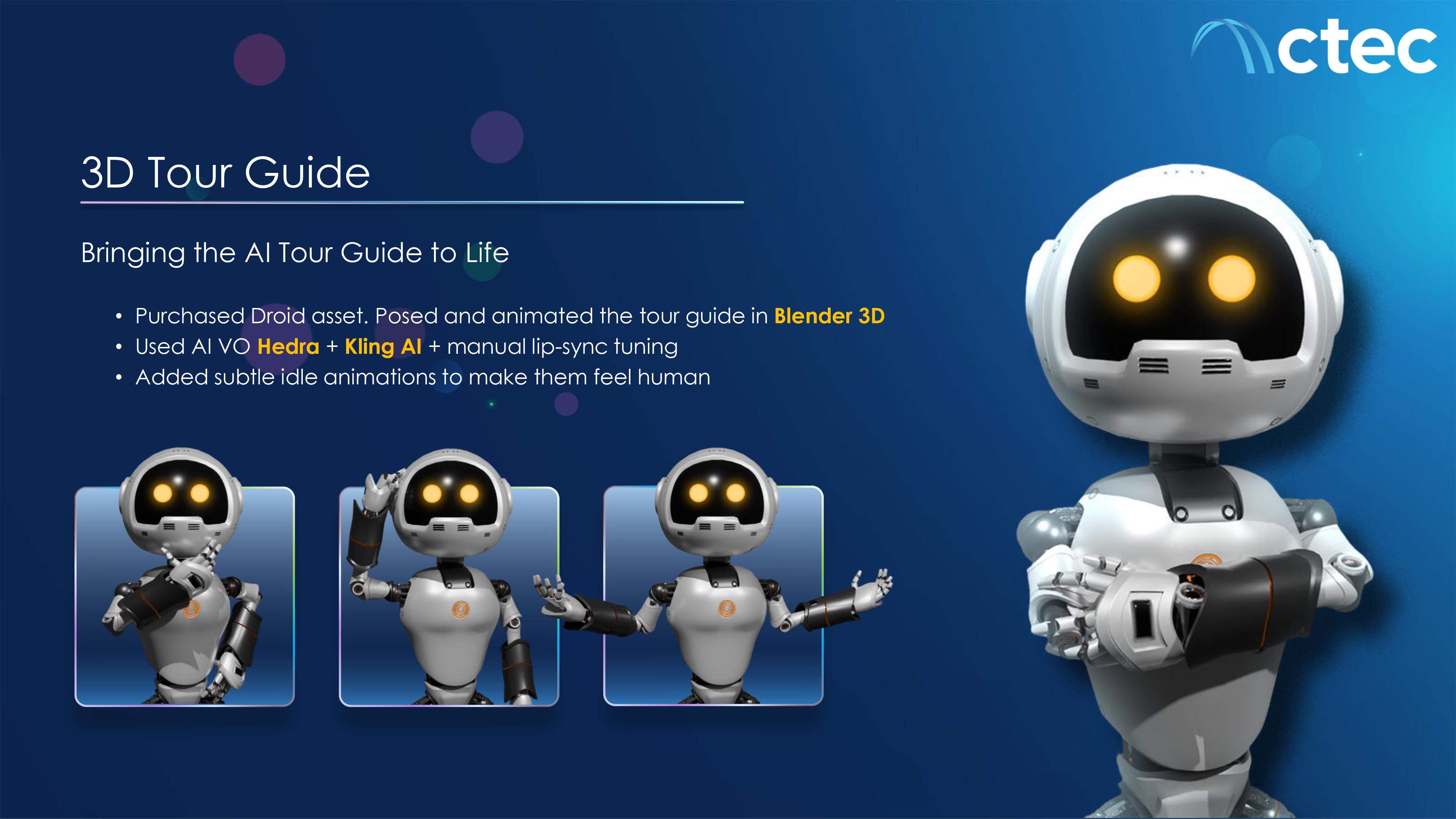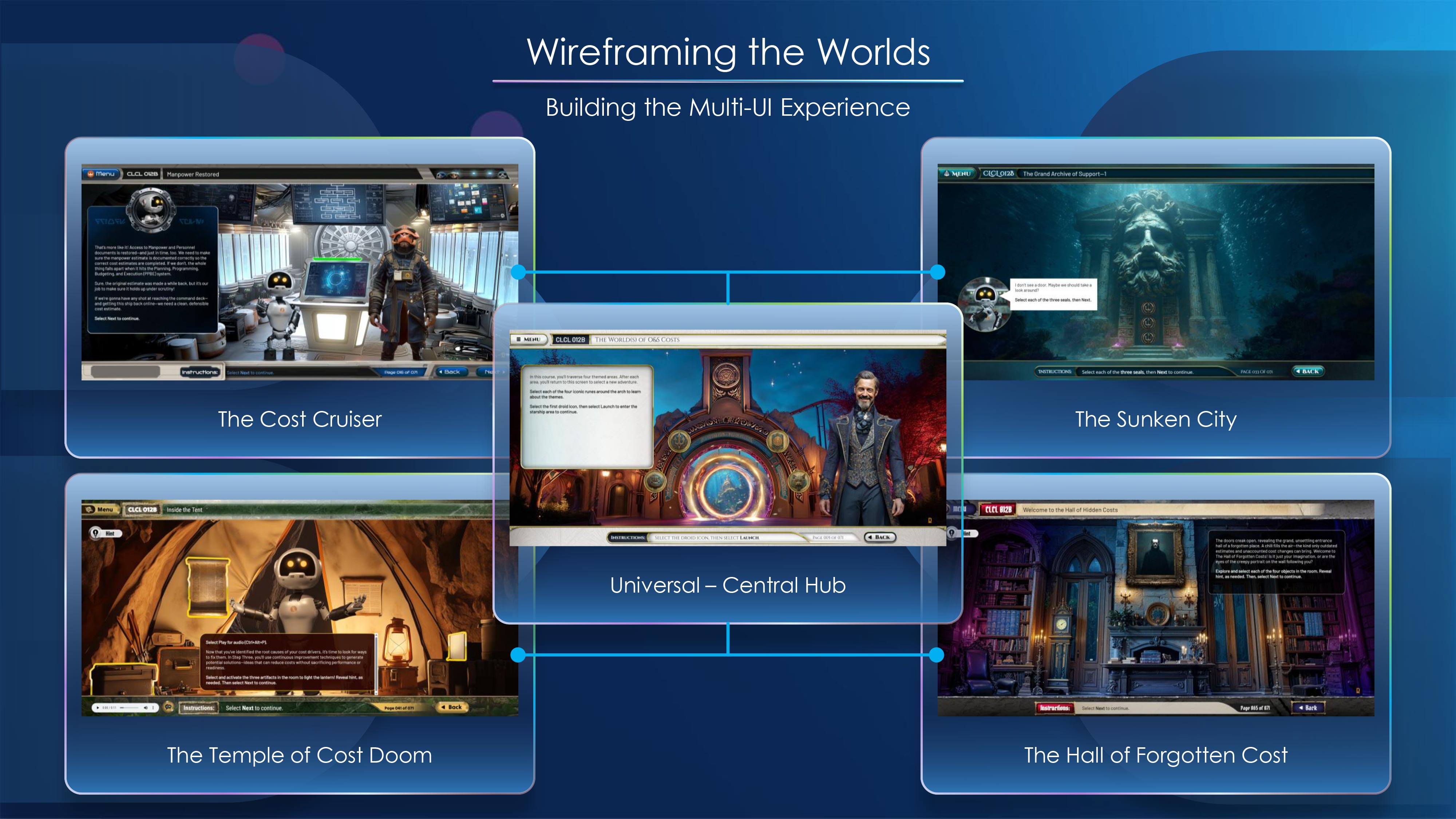 Built a multi-world, cinematic capstone experience within a strict production timeline alongside overlapping projects. Designed a modular UI system adaptable across themed environments, developed narrative-driven puzzle interactions, and constructed cinematic sequences using Unreal Engine and Blender. Integrated AI-assisted workflows for concept development, voice generation, and animation testing while refining outputs for visual consistency and Section 508 compliance. Balanced immersive storytelling with real-world O&S forecasting accuracy under enterprise-level constraints.